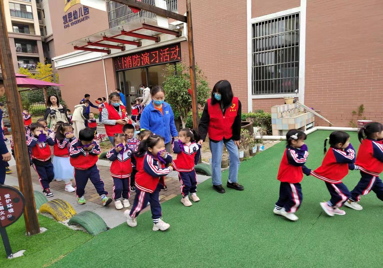 幼儿园广播响起紧急火灾警报声,全体老师和志愿者有序组织孩子们迅速捂住口鼻,伸直身体,井然有序地按照消防逃活路线进行疏散。整个过程用时1分55秒,孩子们全部安全撤离到了安全地带,教师立即清点人数、排好队伍,没有发生任何拥堵、跌倒等景象。