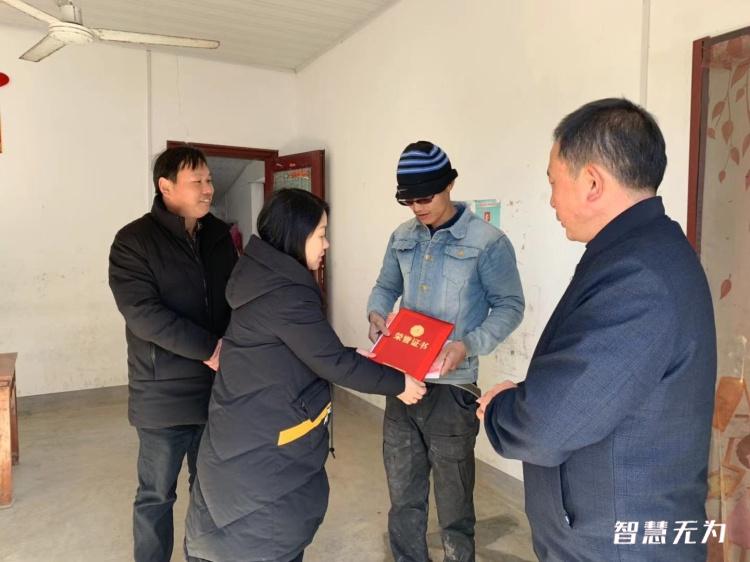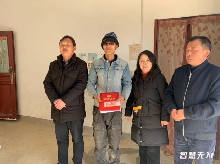上午十点多,谢发红书记等一行人来到伍金志家中,谢书记对伍金志在2020年终疫情防控工做出的贡献给予了高度的赞扬与肯定,并且希冀伍金志能继续发扬优秀质量。应市委宣传部要求,谢书记给伍金志颁发了荣誉证书并给予1000元慰劳金。伍金志笑着接过证书和奖金说道“感激党委政府的关怀,我只是做了我应该做的事,没想到还能给我这样的荣誉,真实是感激不尽啊。”