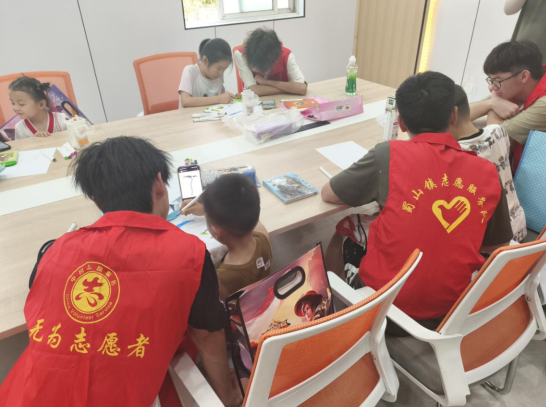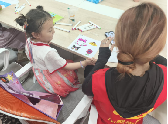活动室内,小萌娃们围坐在铺满画纸的矮桌旁,个个摩拳擦掌、跃跃欲试。志愿者王郑耀俯身在孩子身边,耐心肠手把手引导着稚嫩的小手,为卡通动物涂上艳丽外衣;他还教孩子们用指纹拓印出一朵朵七彩花朵,惹得孩子们阵阵喝彩。“我们专门设计了涂色绘画、手指画、简笔涂鸦等课程,就是想用最轻松的方式,开启孩子们的艺术感知之旅。”志愿者队长潘昊陵引见道。