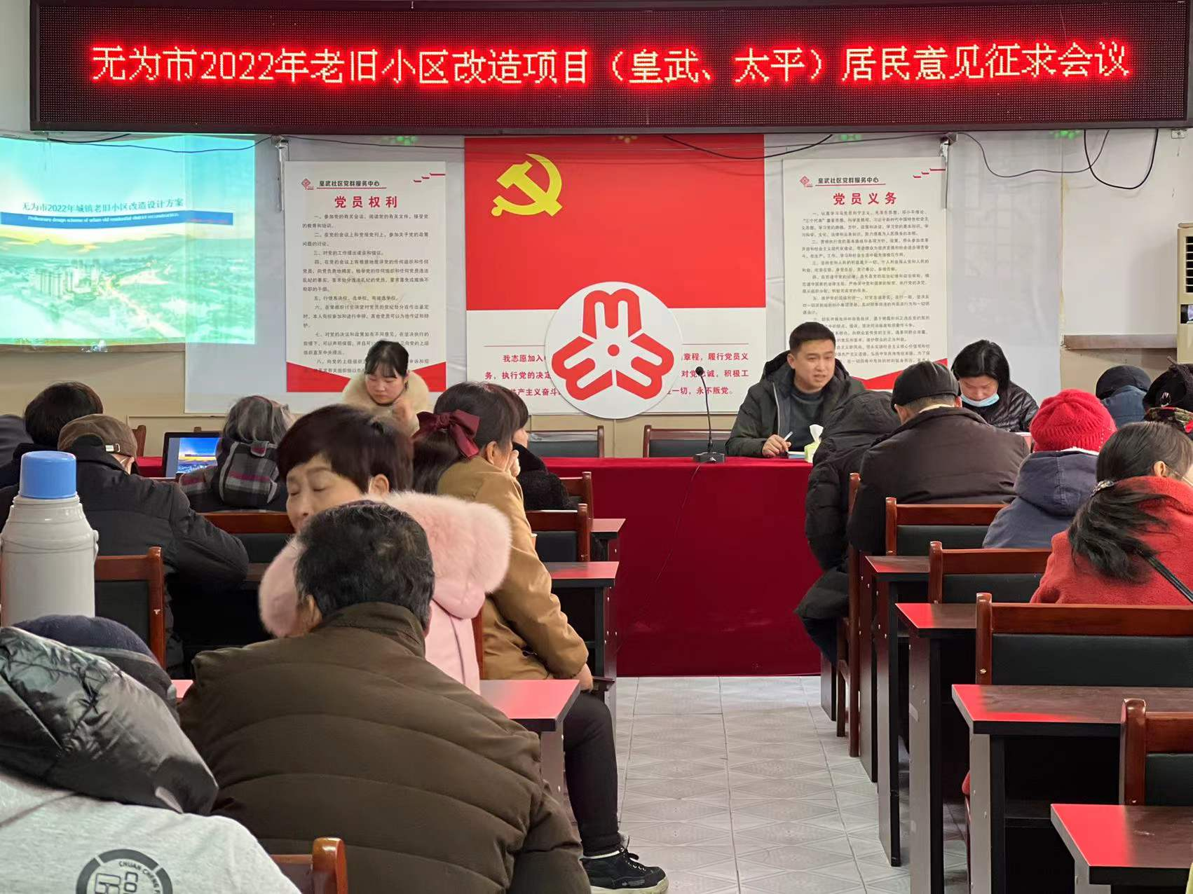 12月27日下午,由有为市住房和城乡建设局牵头,无城镇皇武社区、太平社区配合,约请银杏苑小区及周边小区的居民代表,就2022年银杏苑小区进行老旧小区改造开展居民意见征求座谈会。