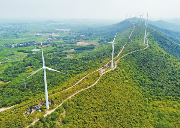 7月25日,记者在有为市严桥镇华电福新风电场看到,挺拔的风电机组点缀在青山绿水间,犹如一座座大风车,构成一幅美丽的乡村画卷。据悉,该风电场共有80台风力发电机组,去年发电量3.54亿千瓦时。(记者 杨大伟 摄)