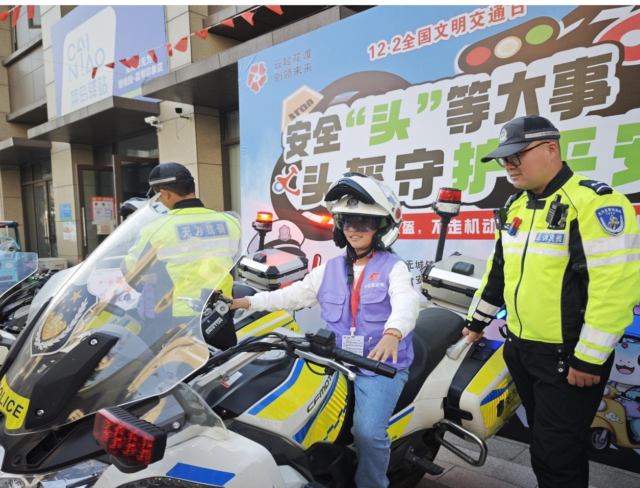 打卡区成为“安全宣传流动窗口”。印着伴有守护交通安全的背景板前,家长带孩子戴盔合影,定格对安全理念的认同与家庭出行承诺。参与者出示配文“安全从‘头’做起,我为头盔安全代言!”的冤家圈,可获取头盔或电动车雨披奖励,让承诺落地。