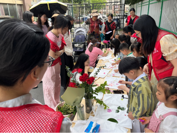 活动现场氛围热烈,充满了创意与活力。社区志愿者为参与者们预备了丰富的自然材料,如形状各异的树叶、艳丽欲滴的花瓣等,以及制造拓染所需的工具。次要是让居民发挥创意,运用“植物拓染”的方式,将搜集树叶、花瓣等自然材料,把植物纹理印在帆布袋上,制造独一无二的帆布袋。