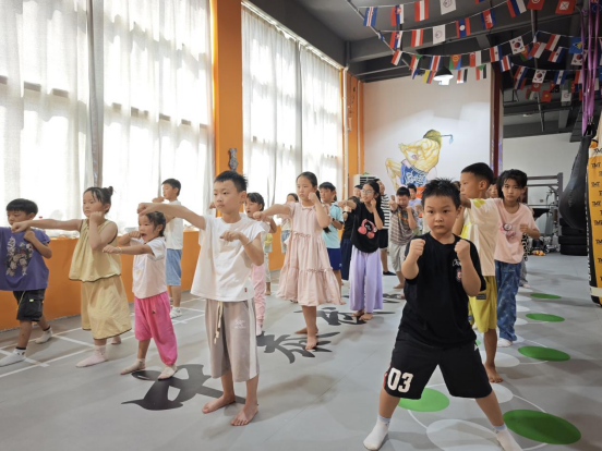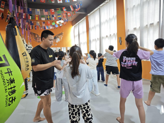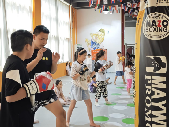 不同于单调的单项训练,课程融入了丰富的互动练习。孩子们两两一组,在武术老师的指点下进行安全攻防演练,在一来一往中感受拳击的力量碰撞与节拍变化,欢声笑语充满了整个课堂。