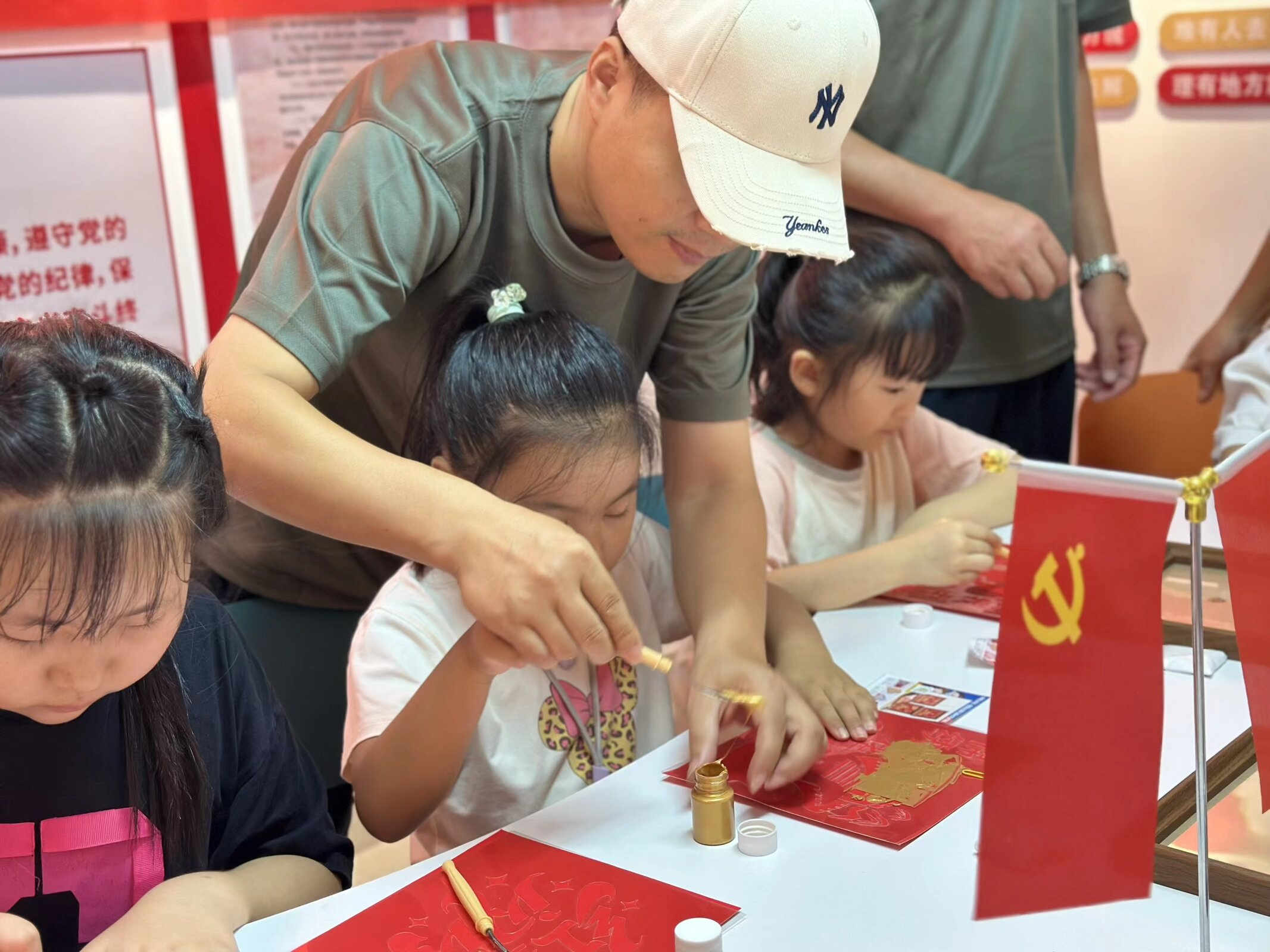 爱国红色主题拓印手抄报活动中,孩子们手持红纸、黄色颜料,借助五角星、军旗等模板,创作出“我心中的军人”“文明拥军小举措”等主题作品,家长们从旁协助构思,亲子协作间传递着文明家风的温度;集体绘长画环节以“致敬军人,守护家园,共建文明社区”为主题,孩子们分组合作,在5米长卷上细腻描绘出军人守护、国旗飘扬、邻里和睦的文明场景,画笔间凝聚着对军人的敬意与对社区文明的美好向往。