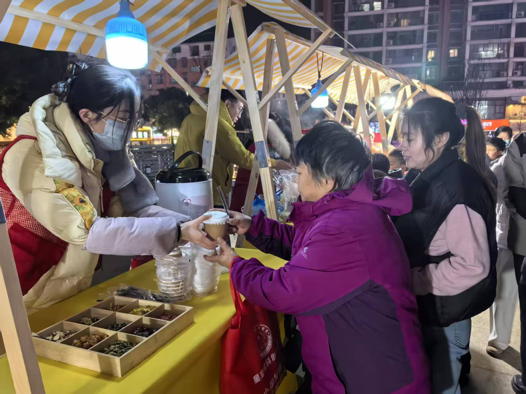 活动现场的市集区域繁华非凡,各类服务摊位有序排开,成为当晚“艺起来周末剧场”里的一道暖心风景线。其中,巧手剪发摊位前,前来体验的居民络绎不绝,利落的手法、细致的修剪,让大家在家门口就享遭到了便捷的理发服务。暖冬姜枣茶摊位更是人气高涨,一杯杯热气腾腾的姜枣茶被递到居民手中,氤氲的热气解散了冬日的寒意。摊位还贴心预备了多样养生茶材料,居民可根据本身爱好自在搭配,制形成专属便携茶包带回家,将这份暖和延续。