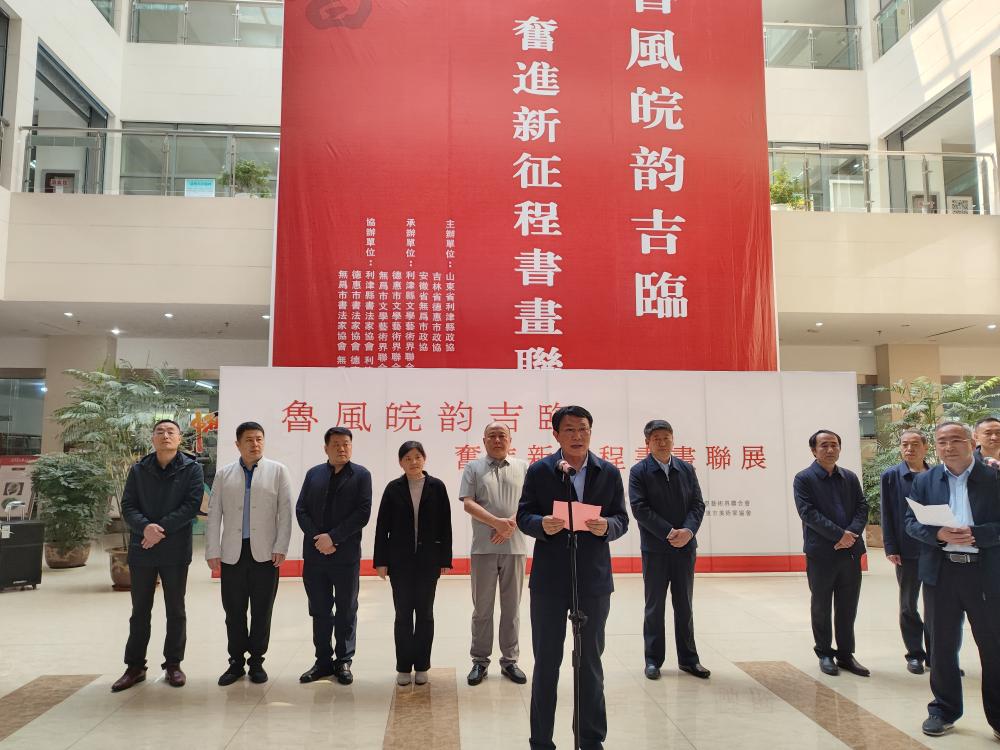 4月26日上午,由山东省利津县政协、安徽省有为市政协、吉林省德惠市政协联合主办的“鲁风皖韵吉临 奋进新征程”三地书画联展在有为市图书馆开展。有为市政协主席徐启示致欢迎辞并宣布开展。山东省利津县政协副主席毕宜军,吉林省德惠市文联主席王淼分别致辞。有为市政协副主席俞林掌管开幕式。