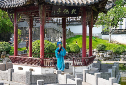 “聚山阁内古琴扬,投砚亭外青衣舞”,有为庐剧市级传承人朱德顺在市米芾留念馆为广大游客带来庐剧选段《张天秀私访》,庐剧演员翟迎娣演唱《秦雪梅观画》选段,是本次活动一大亮点。熟习的唱腔、优美的舞姿吸引一大批庐剧爱好者前来观赏,游客们在景区内沉浸式体验一次传统文明的魅力。