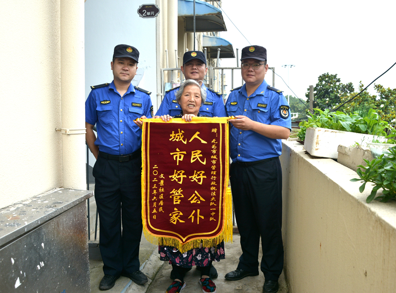 “赵队长,汪队长,你们快进来坐!真的太感激你们了,联系了那么多部门都没处理,就抱着试试看的心态找了你们,你们真的帮我处理好了。你们不是亲人胜似亲人,真的是人民的好公仆!”家住蓝天小区2栋87岁的谷奶奶,一见市城管局中队长赵国庆等人的面,就连声道谢,拉着赵国庆的手,拿出了预备好的印着“城市好管家、人民好公仆”字样的锦旗,坚持要赵国庆收下。赵国庆连称这是城管人应该做的,当不得这样称赞。