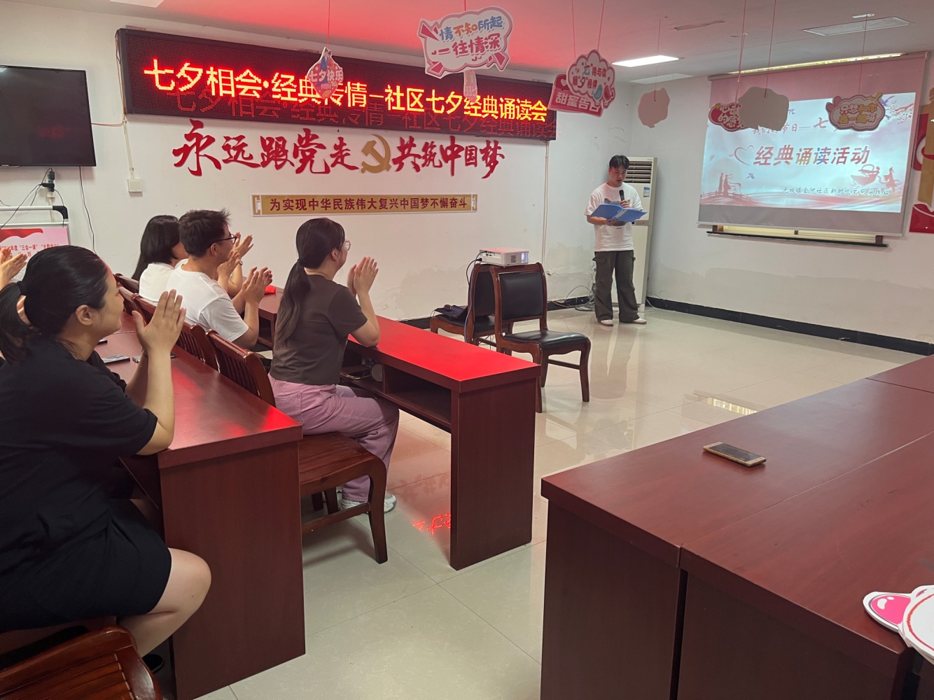 此次社区开展七夕经典诵读活动,以诗相会,以声传情,经过经典诗歌的品读、朗诵和欣赏,弘扬了忠贞不渝的婚恋观,倡导了正确的婚恋观、家庭观,为社区青年营建了浓重的“七夕”文明氛围,提升了社区青年对传统节日的认知,促进他们树立积极的人生追求,崇尚忠贞爱情和向往幸福生活的情怀。(王婷婷)