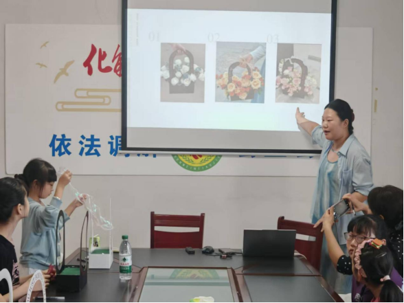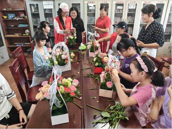 随后,七夕手提花篮制造活动温情上线。志愿者先是生动讲述七夕节的来源,细致解读了“乞巧节”的文明内涵,以及古人借节日寄托“习得巧艺、播种美满”的美好愿望;接着耐心讲解插花的历史渊源与剪枝、配色、固定等适用技巧,随后有序分发鲜花、花篮、丝带等材料。在志愿者的协助下,孩子们与家长默契配合,时而仔细修剪花枝,时而小声讨论配色,在欢声笑语中完成了一个个独具创意的手提花篮,既体验了动手乐趣,也感受了节日氛围。