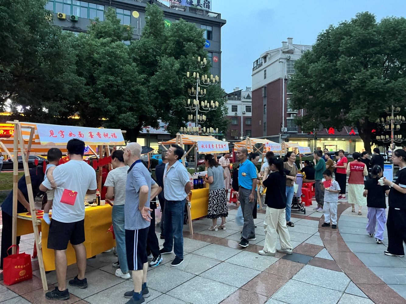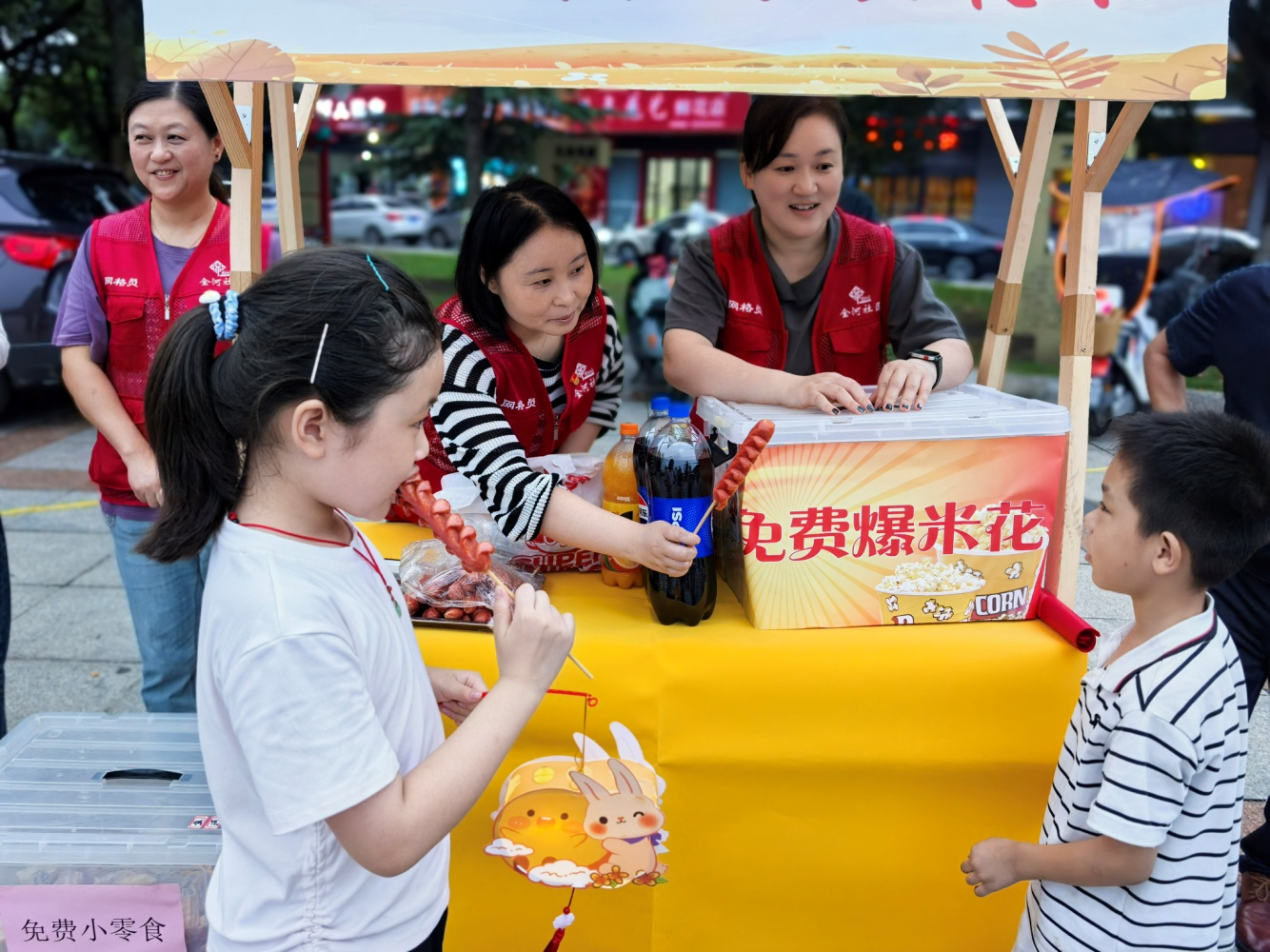 中秋花灯制造区则成为亲子互动的乐园,家长与孩子携手折叠、粘贴,一盏盏外型各异的中秋花灯在笑声中点亮,提早传递节日的温馨。“见字如面”专区墨香氤氲,书法老师挥毫写下“万事顺遂”“邻里一家亲”等祝愿语,居民们争相领取这份手写温情。最受欢迎的,莫过于“免费零食摊位”,烤肠、爆米花,以及各种饮品等时令小零食供不应求,居民王阿姨笑言:“边吃边逛,像过年一样繁华!”