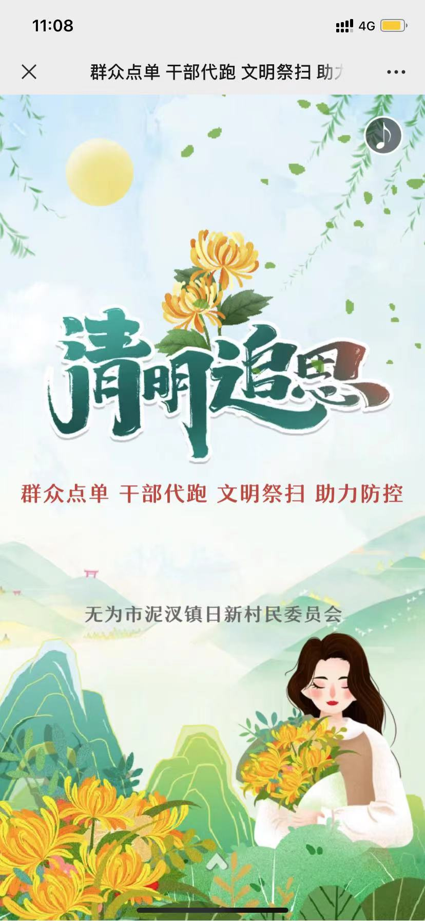 4月1日下午,泥汊镇日新村委托第三方企业开发制造的清明追思祭奠平台正式上线。手机点击进入有为市泥汊镇日新村民委员会“清明代祭扫服务”小程序,由群众点单、干部志愿者代跑,这样的方式为在外地工作和战“疫”特殊时期不便上坟的群众提供了代祭扫服务。