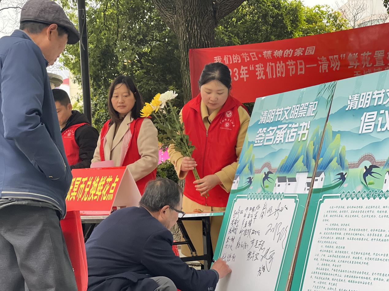活动中现场设置了“纸冥币兑换鲜花点”“文明祭祀签名承诺牌”,志愿者们大力引导居民签字承诺,摒弃焚烧纸钱、纸币等祭祀陋习,可以带着先前已购买过的纸冥币来兑换点兑换鲜花一束,用于清明祭祀。盲目树立文明祭扫新风尚,用愈加文明的方式表达对祖先的缅怀之情。
