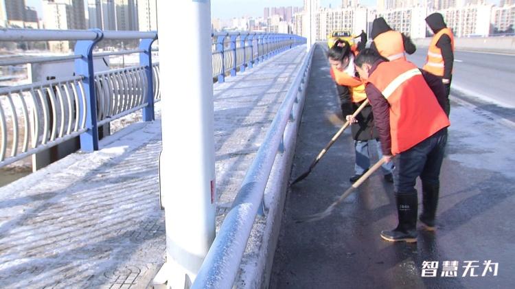 异样,在城南比亚迪大桥上,记者看到市交通运输局养护人员正在对道路上的积雪、薄冰进行铲除,并撒放融雪剂,防滑料等,并在大桥两端设立警示牌。