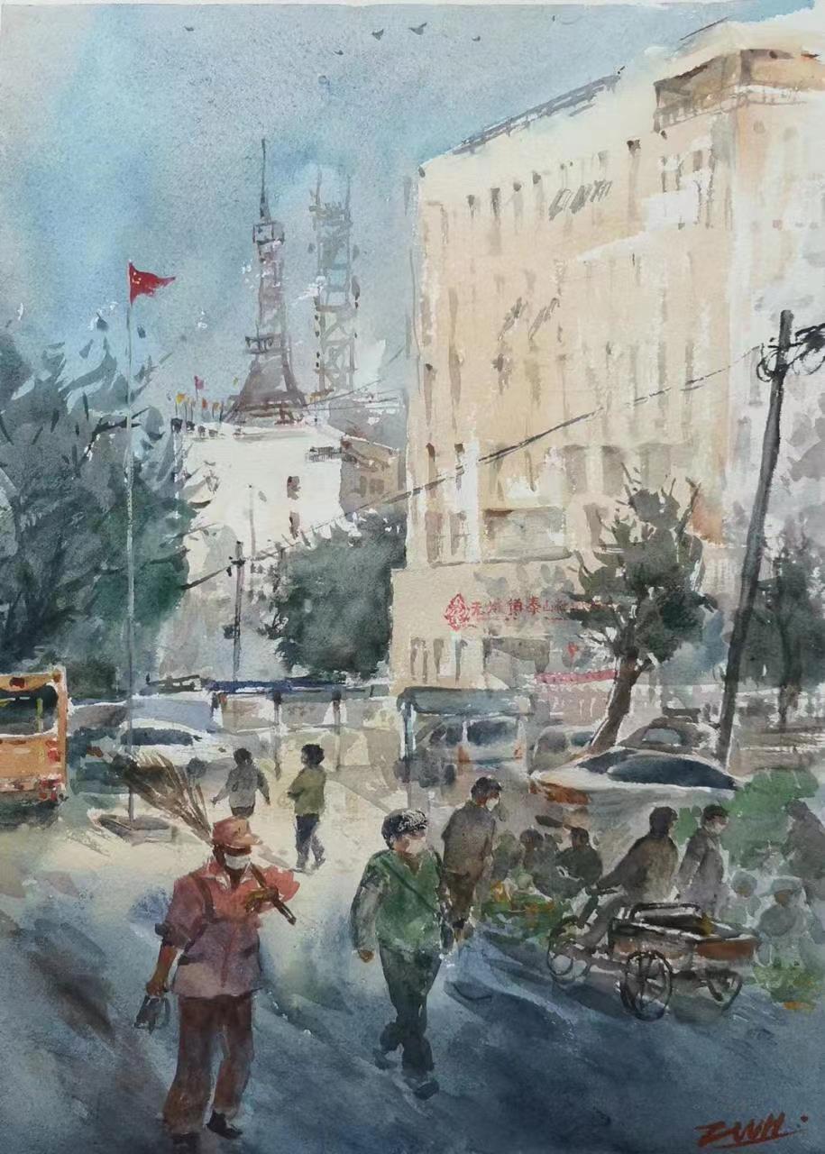 周文海 《泰山社区写生》水彩画