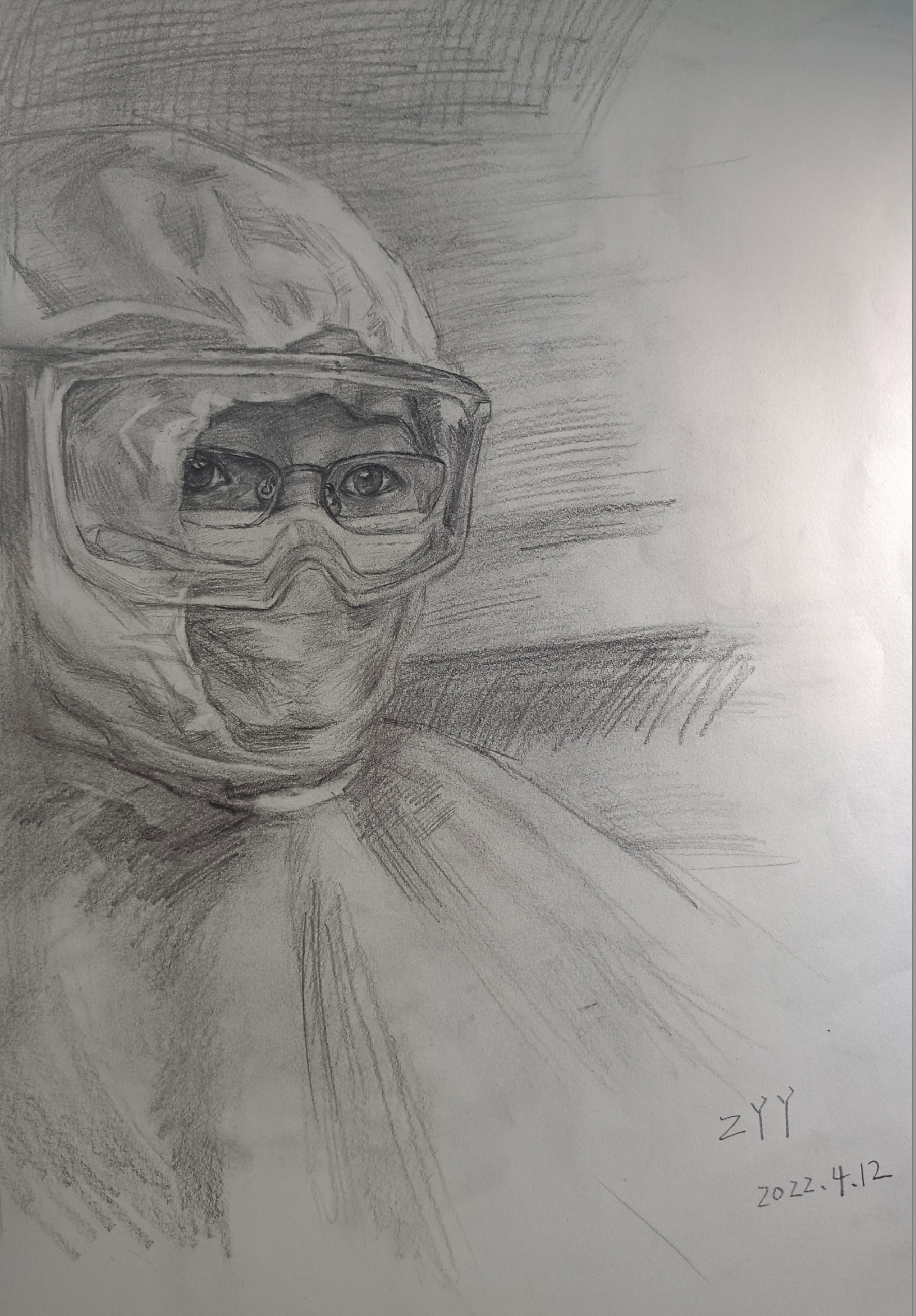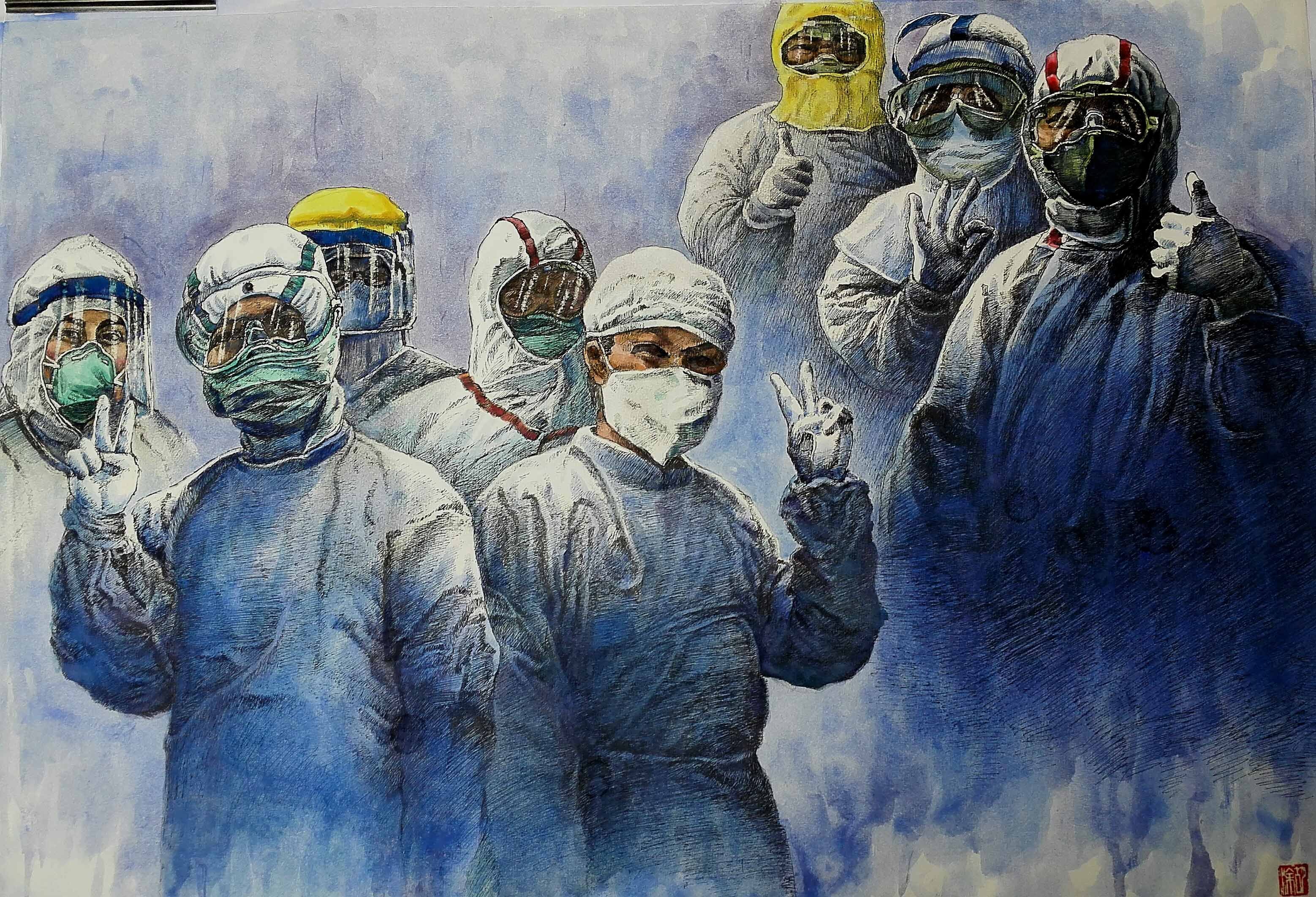 描绘了白衣战士面对疫情,逆行而上,为保护广大群众的生命安全作出了无私地奉献的画面。