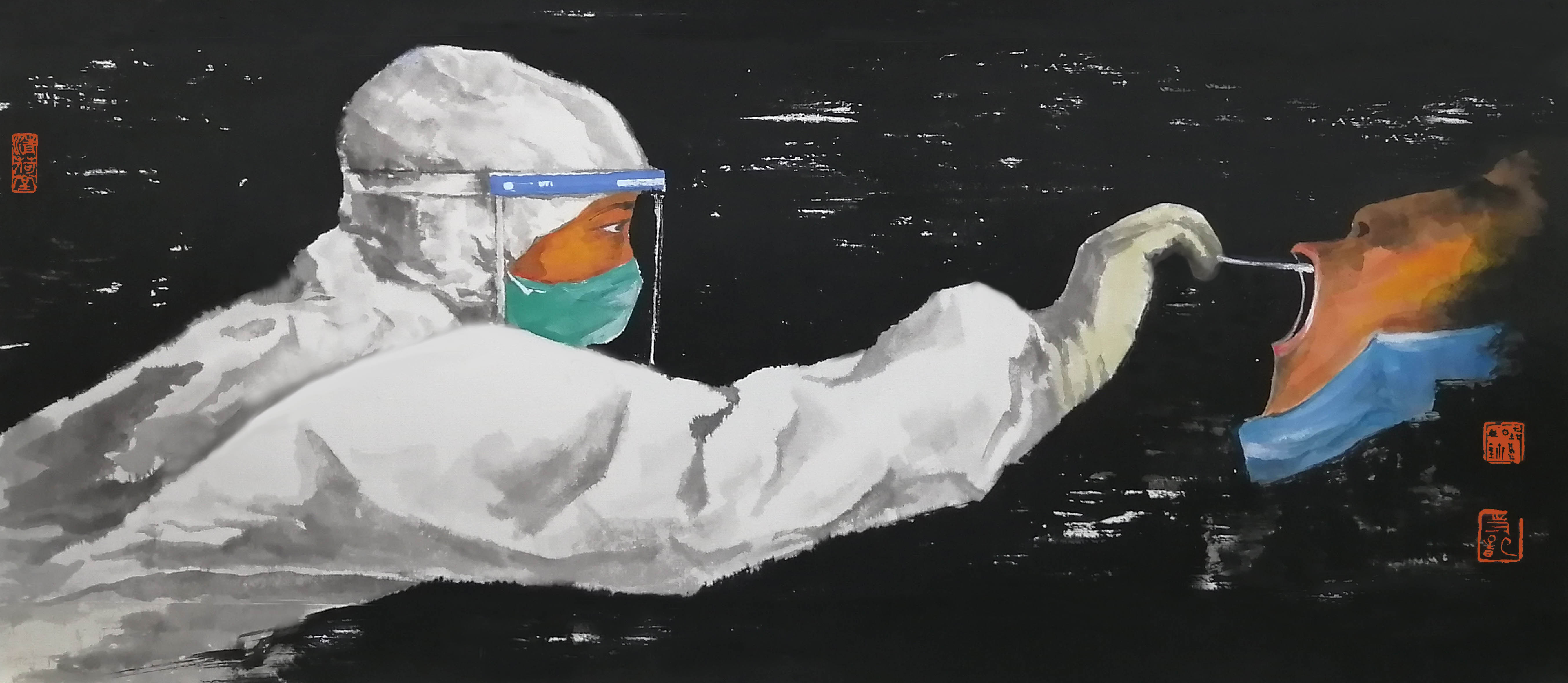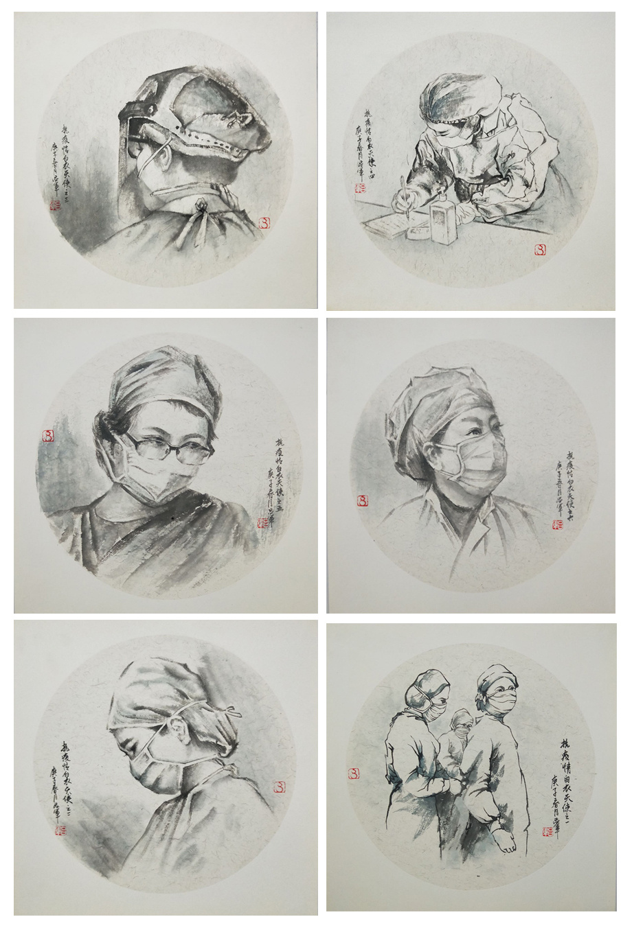 以一组水墨人物头像组成一幅画,目的是表现医务工作者奋战在抗击疫情一线的不同精采瞬间,以此来赞誉我们可敬可爱的白衣天使。