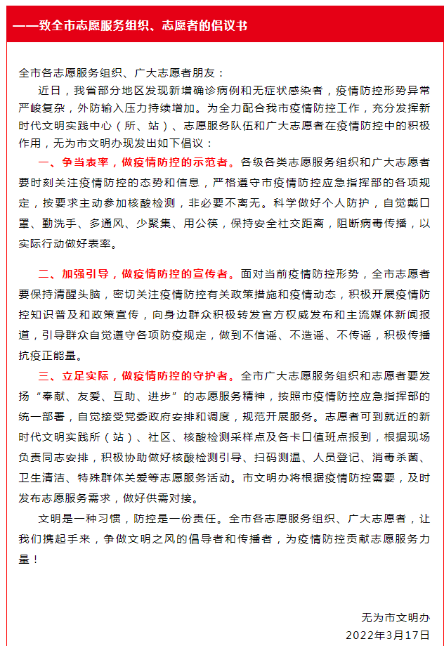 自有为市文明办3月17日发出《防控疫情 志愿有我--致全市志愿服务组织、志愿者倡议书》以来,全市各新时代文明理论中心(所、站)、市直机关各单位、志愿服务组织广泛动员近3000名志愿者奋战在疫情防控第一线。志愿者们按照党委政府的安排和调度,全力配合疫情防控工作,规范开展志愿服务。3月中下旬,该市开展两轮的全市范围内的区域核酸检测,志愿者有序参与各核酸检测点采样工作,协助做好核酸检测引导、扫码测温、人员登记、消毒杀菌、特殊群体关爱等志愿服务活动。全覆盖的区域检测,工夫紧,义务重,有的志愿者们不间断工作长达15小时以上。协助社区(村)开展疫情防控工作时,志愿者们则更是集信息员、宣传员、服务员等多重”身份“于一身,welcometo欢迎光临888集团·主頁欢迎您welcometo欢迎光临888集团·主頁欢迎您welcometo欢迎光临888集团·主頁欢迎您电话随访、入户调查、宣传政策、物品代购代送、心思引导等,用实践举动凝聚爱的力量。