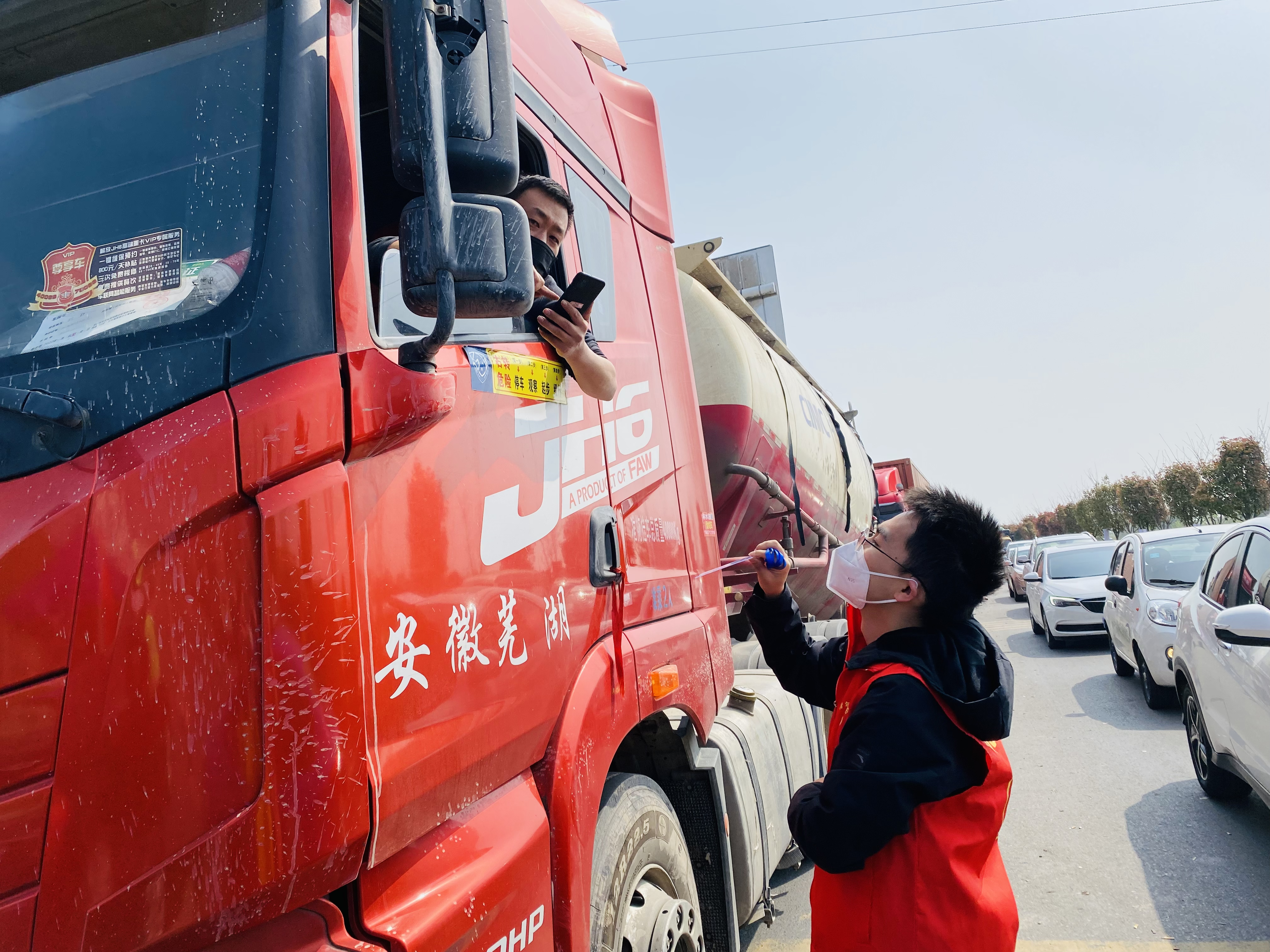 泥汊镇新时代文明理论志愿者在华龙交通卡口检查过往车辆安康码、行程码