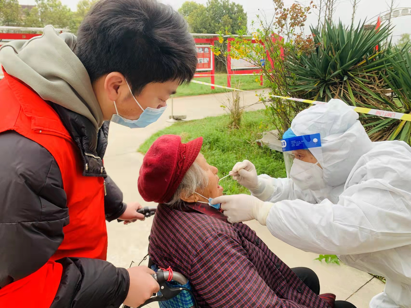 赫店镇新时代文明理论志愿者在核酸检测点协助举动不便的老人进行核酸检测