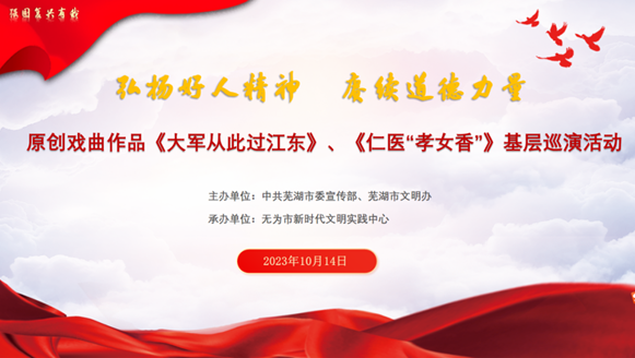 10月14日,原创戏曲作品《大军从此过江东》、《仁医“孝女香”》基层巡演活动在有为市青少年活动中心举办,活动由中共芜湖市委宣传部、芜湖市文明办主办,有为市新时代文明理论中心承办。此次活动旨在大力弘扬道德模范和身边好人精神,着力进步人民道德水准和文明素养,经过艺术化方式对广大群众进行思想政治教育,打通宣传群众、教育群众、服务群众的“最后一公里”,积极营建崇德向善、见贤思齐、积极向上的浓重良好社会氛围。