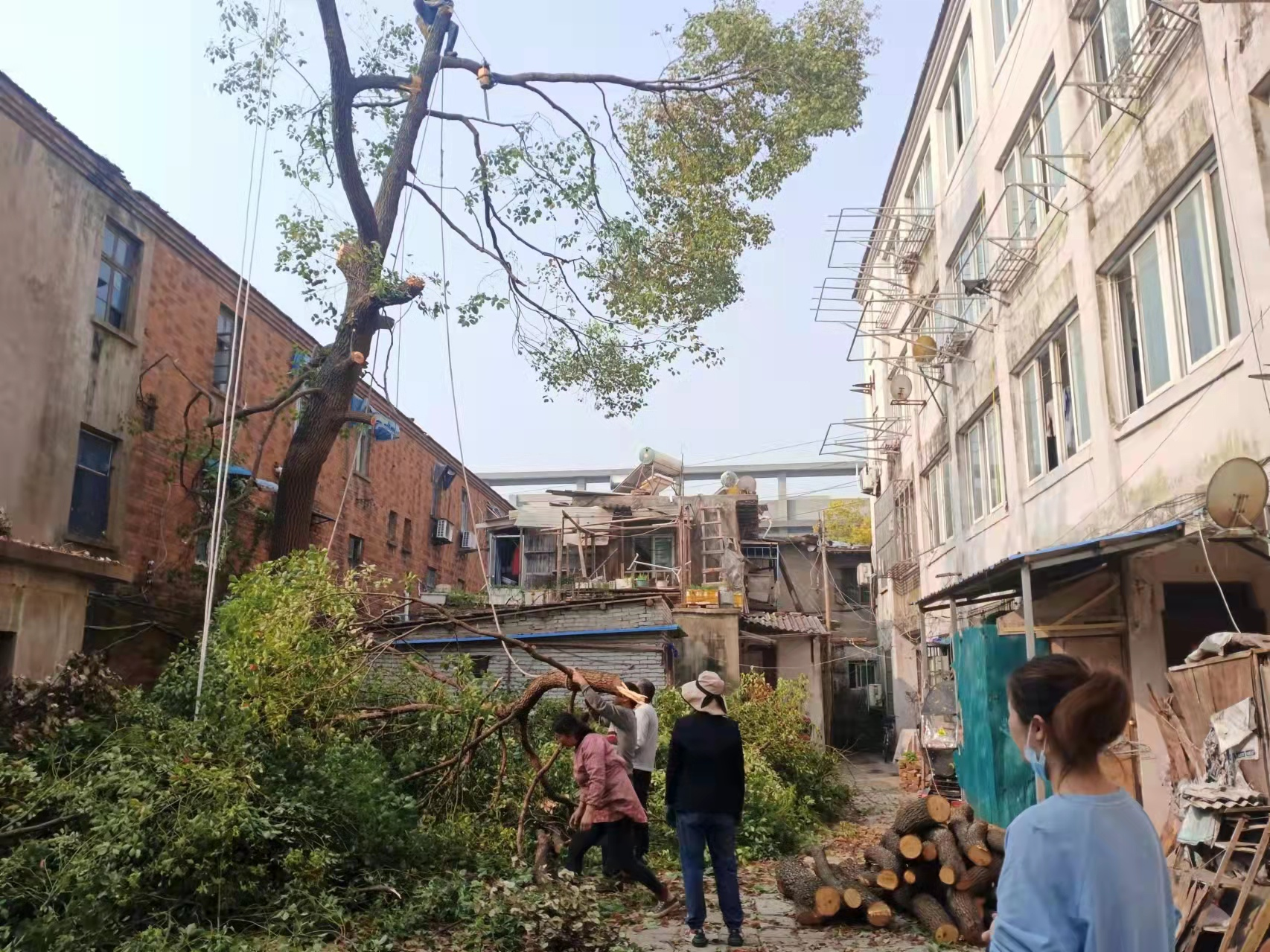 第二步,巧修剪。无纺集体宿舍4栋后大树遮挡着采光,居民反映激烈,泰山社区党委安排专业修剪人员到现场查看,对树枝进行了修剪,并及时清走修剪上去的树枝。适当的修剪不只促进树木生长,也使小区环境得到全体改善。