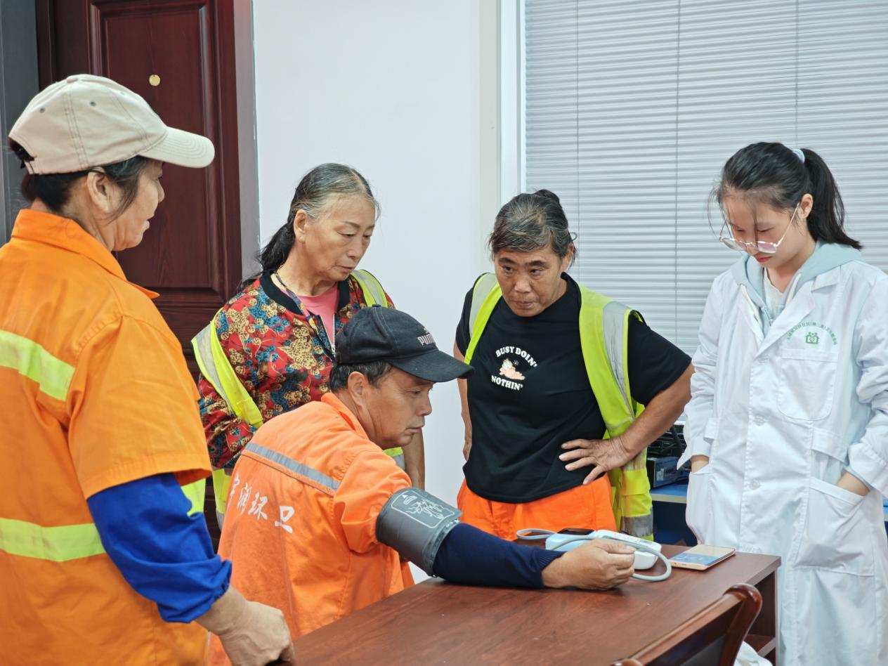 健康讲座结束后,义诊环节随即拉开帷幕。社区卫生服务站的医生为环卫工人提供了免费的血压测量、血糖检测,以及内内科咨询等服务。医护人员耐心细致地为环卫工人进行检查,详细讯问他们的身体状况和用药状况,并根据检查结果给出个性化的健康建议。