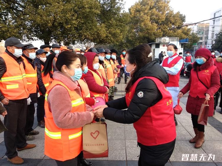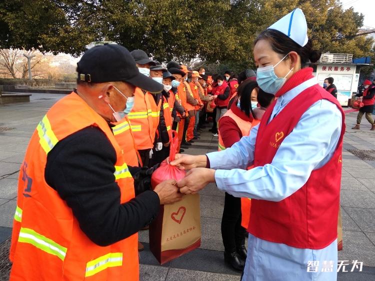 在市文明办担任人和过往群众的见证下,有为市大爱有为志愿者协会担任人带领志愿者向永昊环卫公司环卫人员送去50余份慰劳品,每份慰劳品包括腊八粥、毛巾、香皂、口罩等。面对环卫人员,会长李维秀说:“环卫工人是改善环境的美容师,每当清晨我们在熟睡的时分,环卫工人就早早的在路上打扫卫生,无论是三九酷寒,还是高温酷暑,他们起得最早,干的是最脏最苦的活。受有为市城管局倡议全社会‘关爱城乡美容师’活动感化,我觉得劳动最光荣,春节临近,我们开展腊八节送腊八粥活动,是对环卫工人辛劳付出的肯定,借此表达对环卫工人的关爱。”