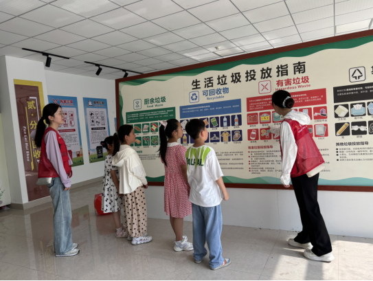 活动开始,社区宣讲员带领孩子们参观宣教基地,并经过图文结合的方式生动讲解垃圾分类的意义、垃圾分类标准及技巧,让孩子们初步了解了垃圾分类相关知识。