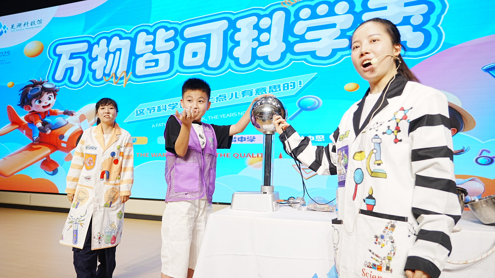 在科普实验环节。老师们带领孩子们参加“万物皆可科学秀实验”。经过怒发冲冠、循环彩带、马德堡半球等互动实验,将科技和魔术相结合,带领孩子下台参加实验,体验科学的奥妙。“我刚才也体验了下静电,全身都好像触电一样,麻麻的感觉,真风趣”